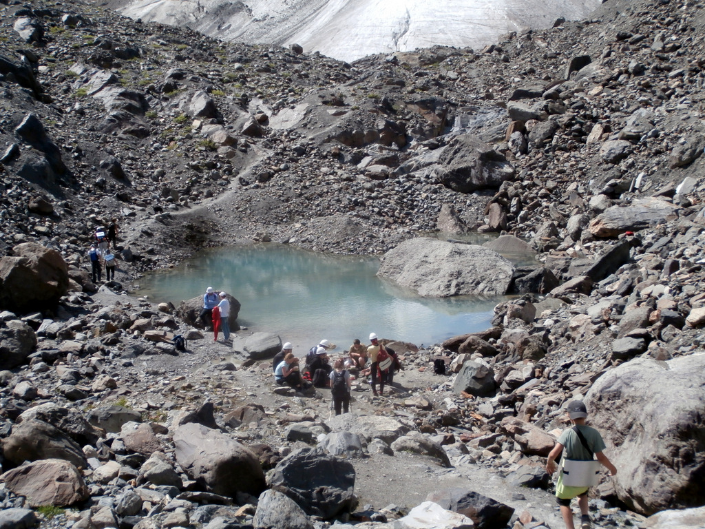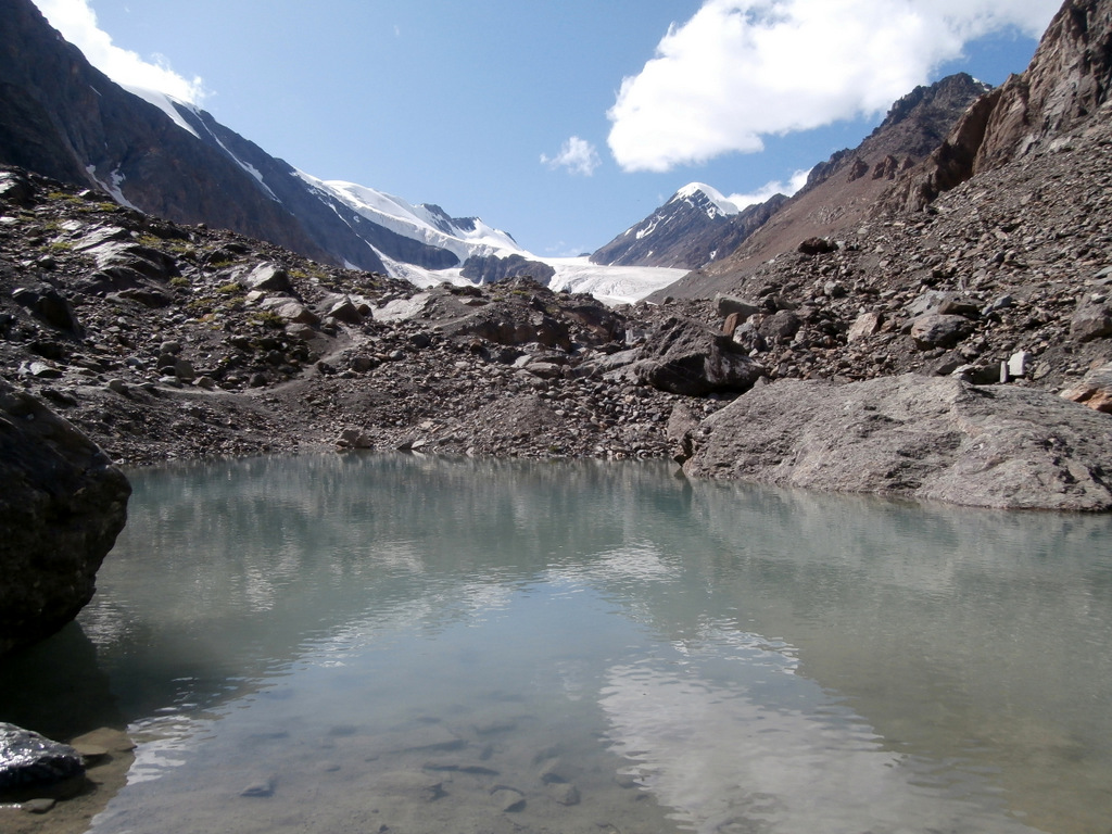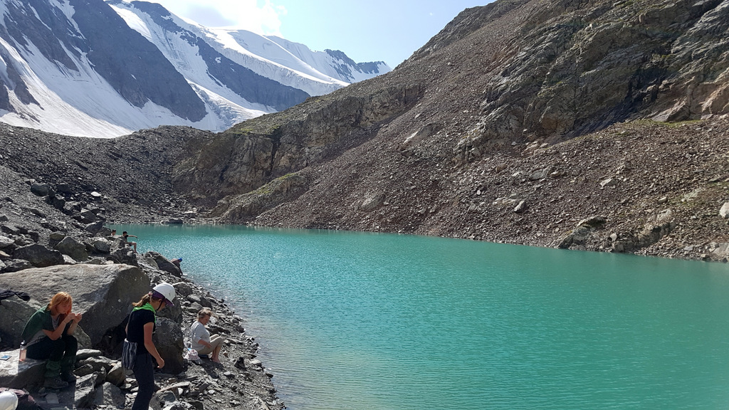 После подъёма мы подошли к маленькому бирюзовому озеру. Здесь был роскошный вид на ледник Актру и на саму гору Актру (4044 метра).