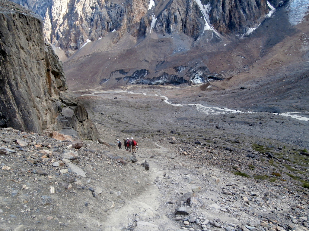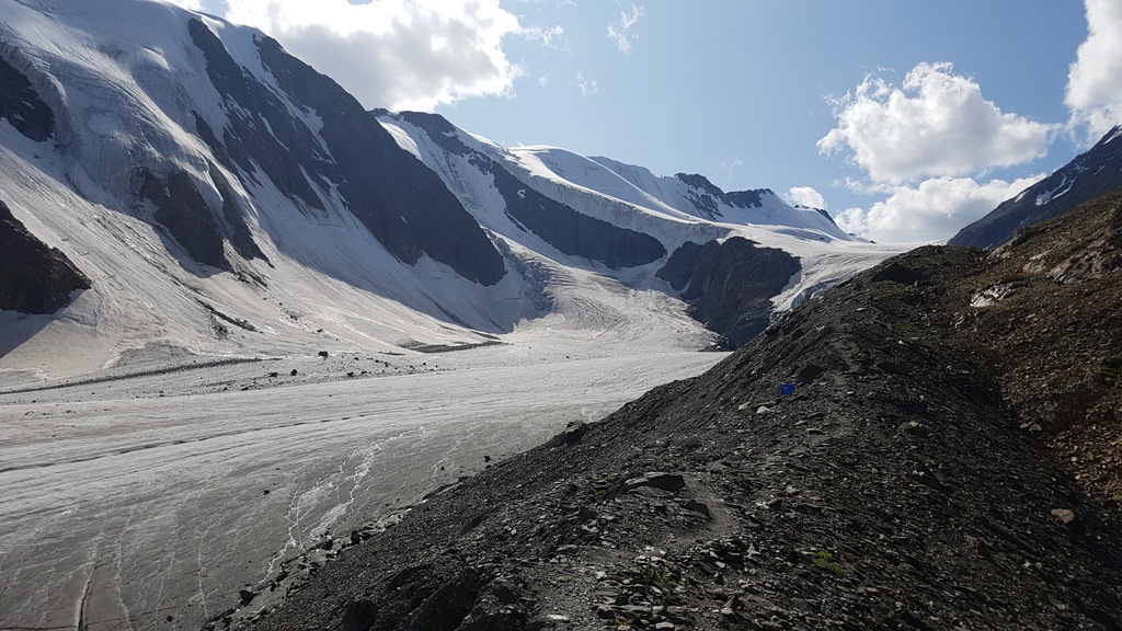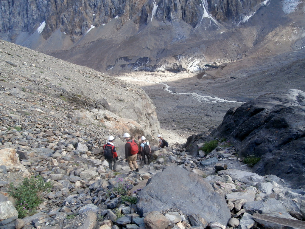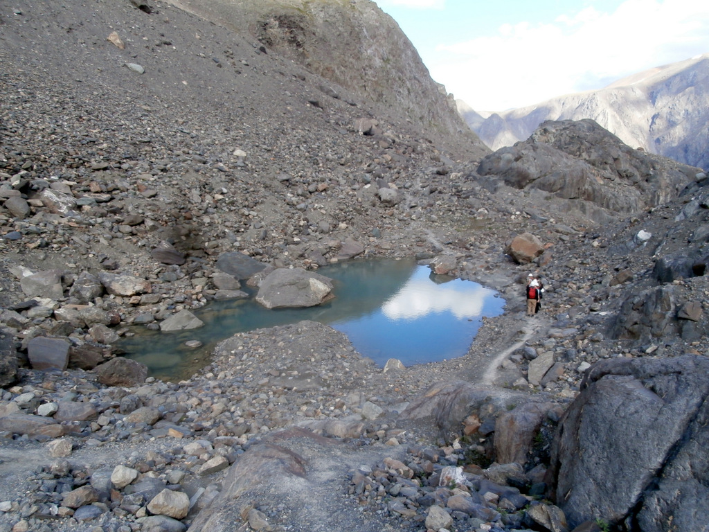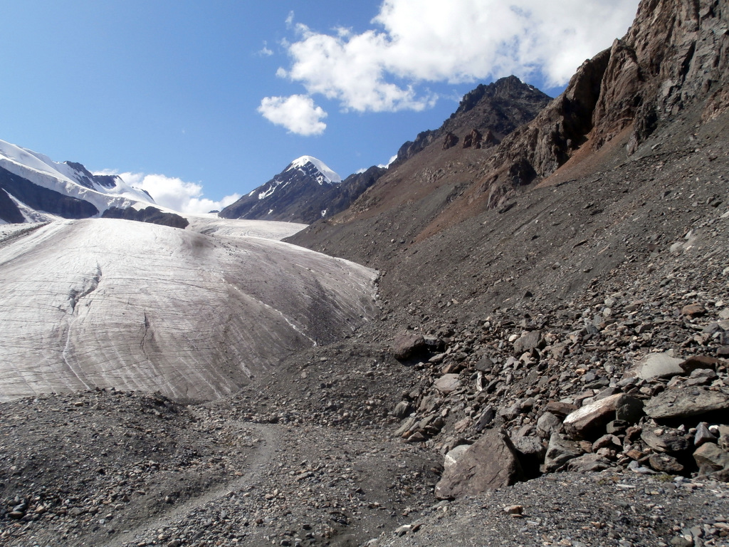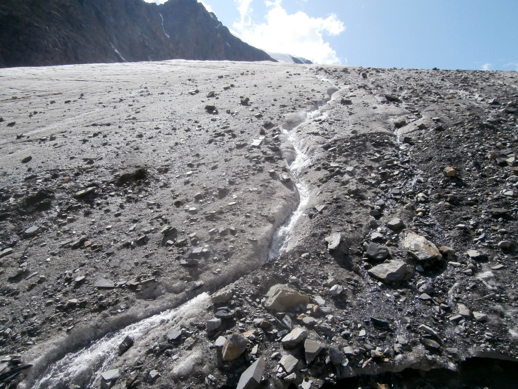Пошли. Тропа по сыпухе. Слева могучий ледник. Видно, как он тает. Струи воды бегут по леднику в углублениях, извивающихся, как змейки. Интересное явление.