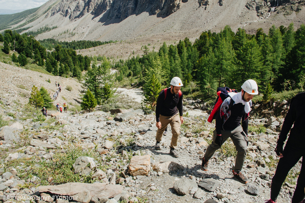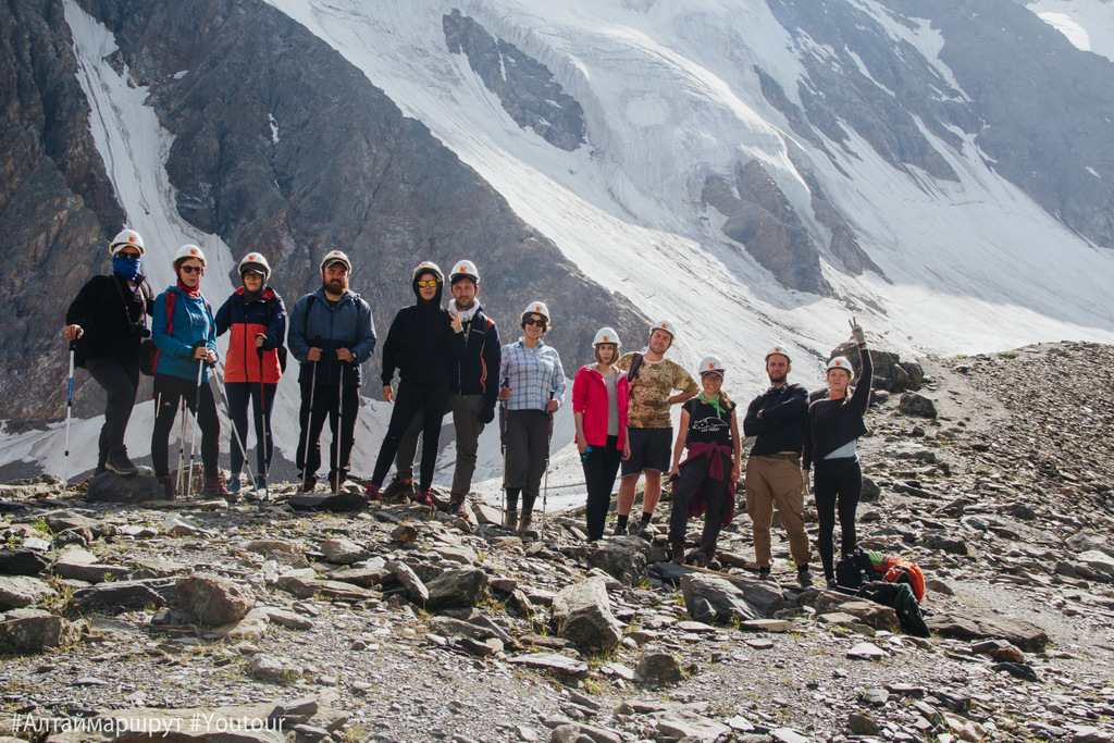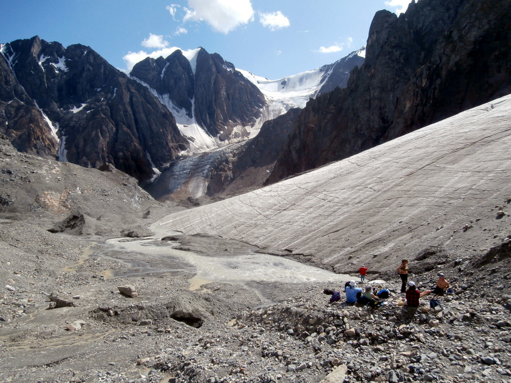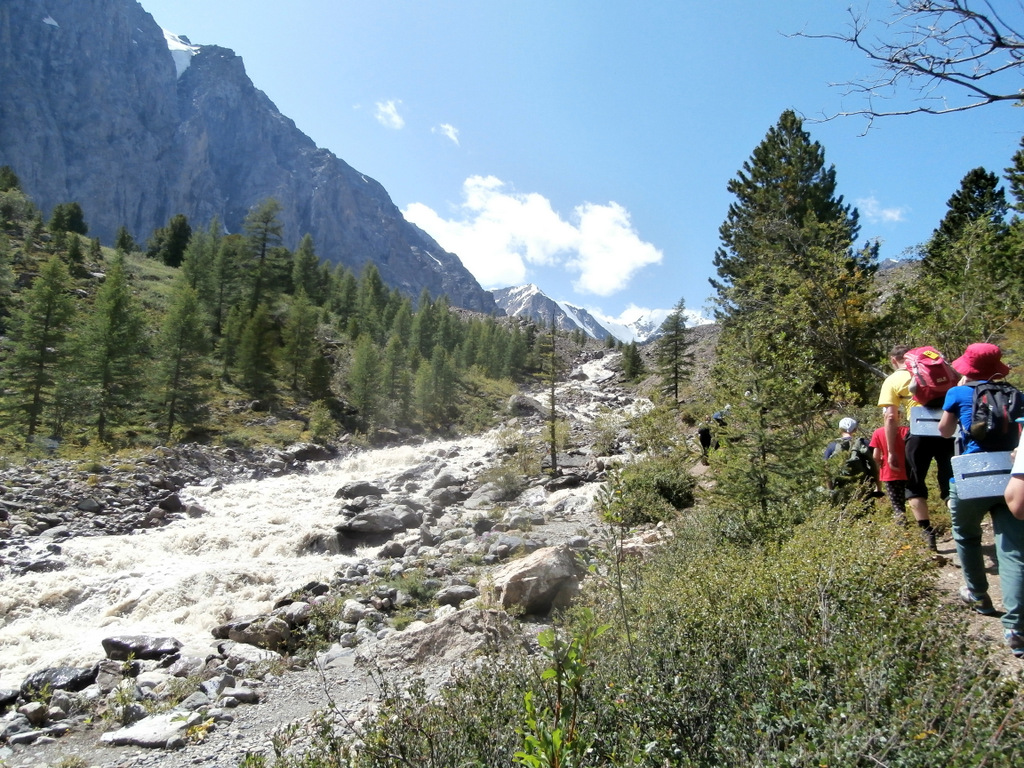 Потом лес кончился, и мы оказались прямо у подножия гор. Виды вокруг вызывают непередаваемый восторг. Затем доехали  до альплагеря Актру, расположенного на высоте 2100 метров и отсюда в 12 часов вышли в поход к леднику и Голубому озеру. Предварительно нам выдали каски, как защиту от камней, которые могут невзначай прилететь со склонов.