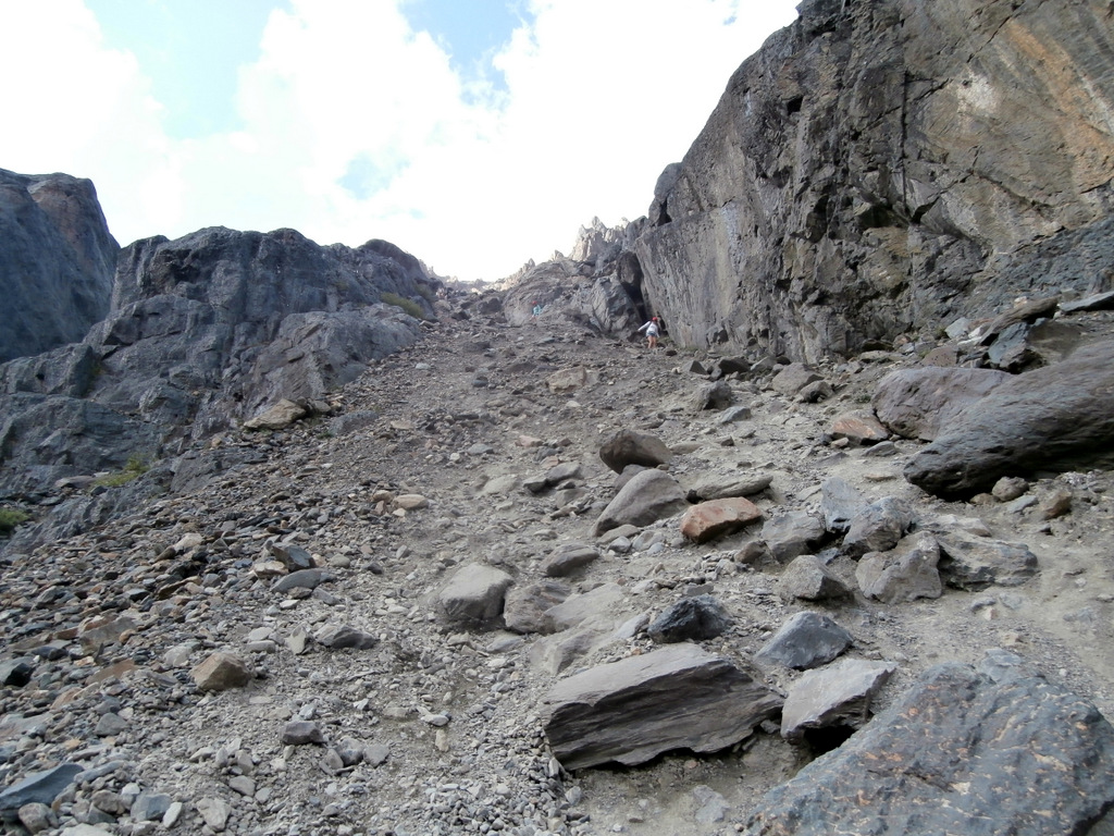 По курумнику сначала был подъём, затем относительно ровная часть, а потом довольно крутой спуск. Камни небольшие, и я прыгала по ним, как горная козочка 🙂 .