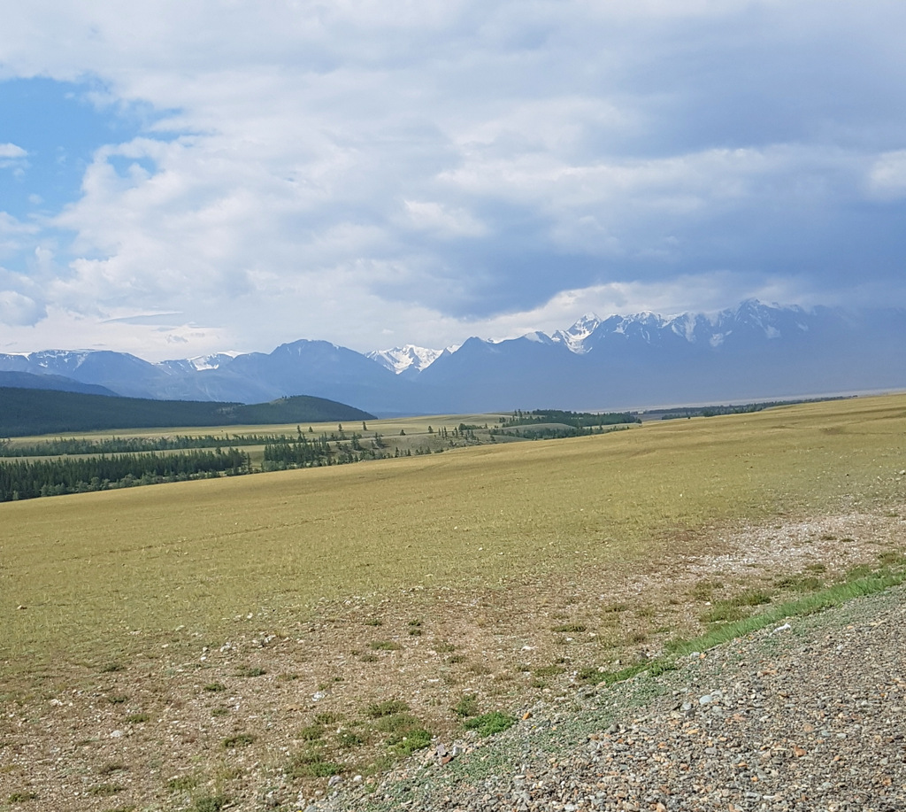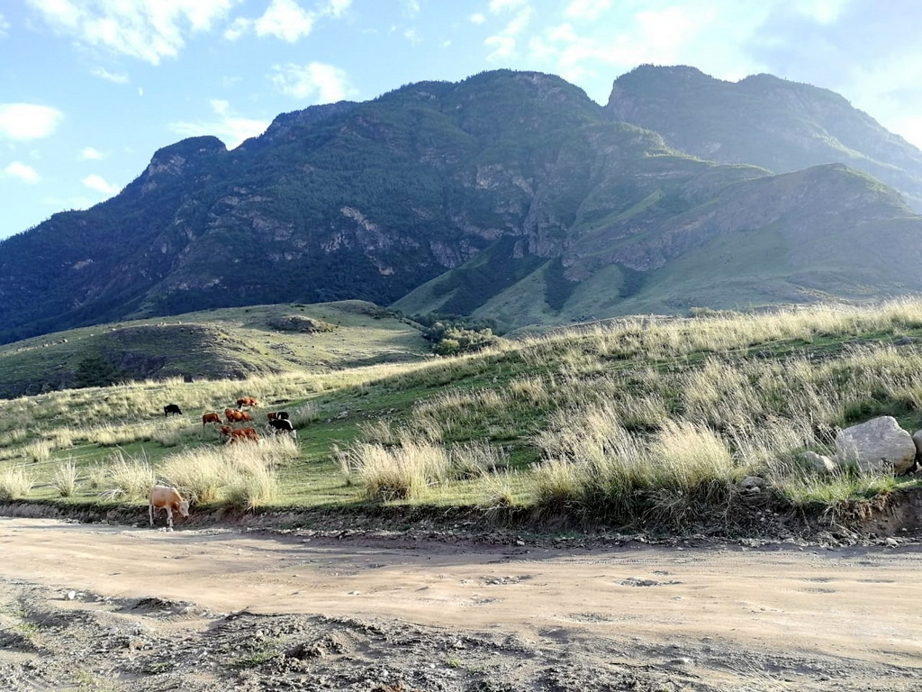 Виды по дороге. На фоне хребта выделяется вершина Актру.