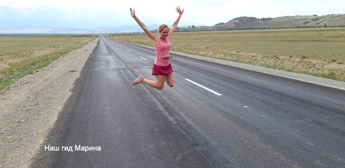 По дороге любовались красивейшими пейзажами. Сделали остановку, и каждый из нас сфотографировался на фоне Чуйского тракта и Северо-Чуйского хребта. Марго, наш личный фотограф, знала, где нужно остановиться, чтобы фото получилось наиболее эффектным. И, кстати, нам было очень весело во время фотосессии 🙂 .