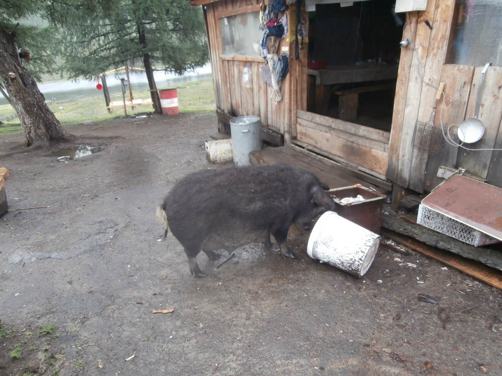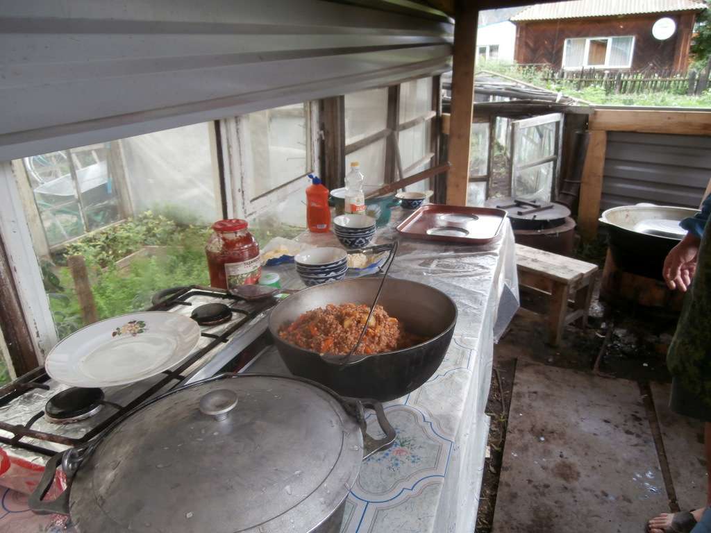 Вернулись на стоянку и пообедали. Повар Алтын побаловал нас вкусной едой — тефтели с гречкой. Эту еду мы привезли в большом казане, и она была ещё теплая.