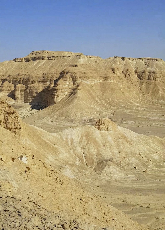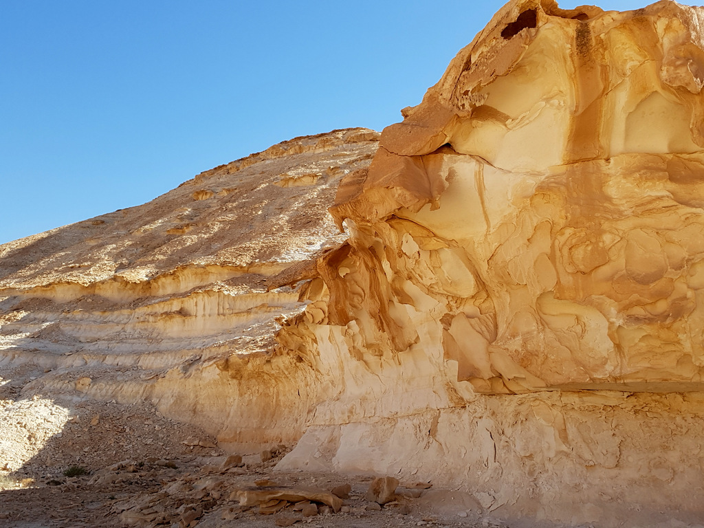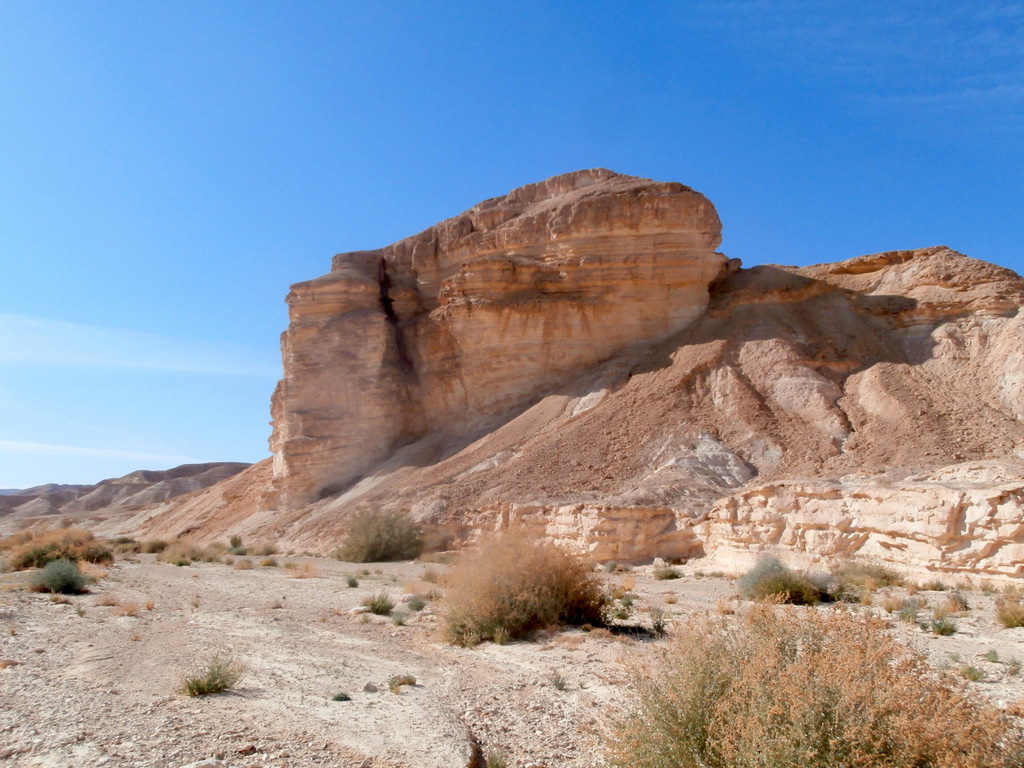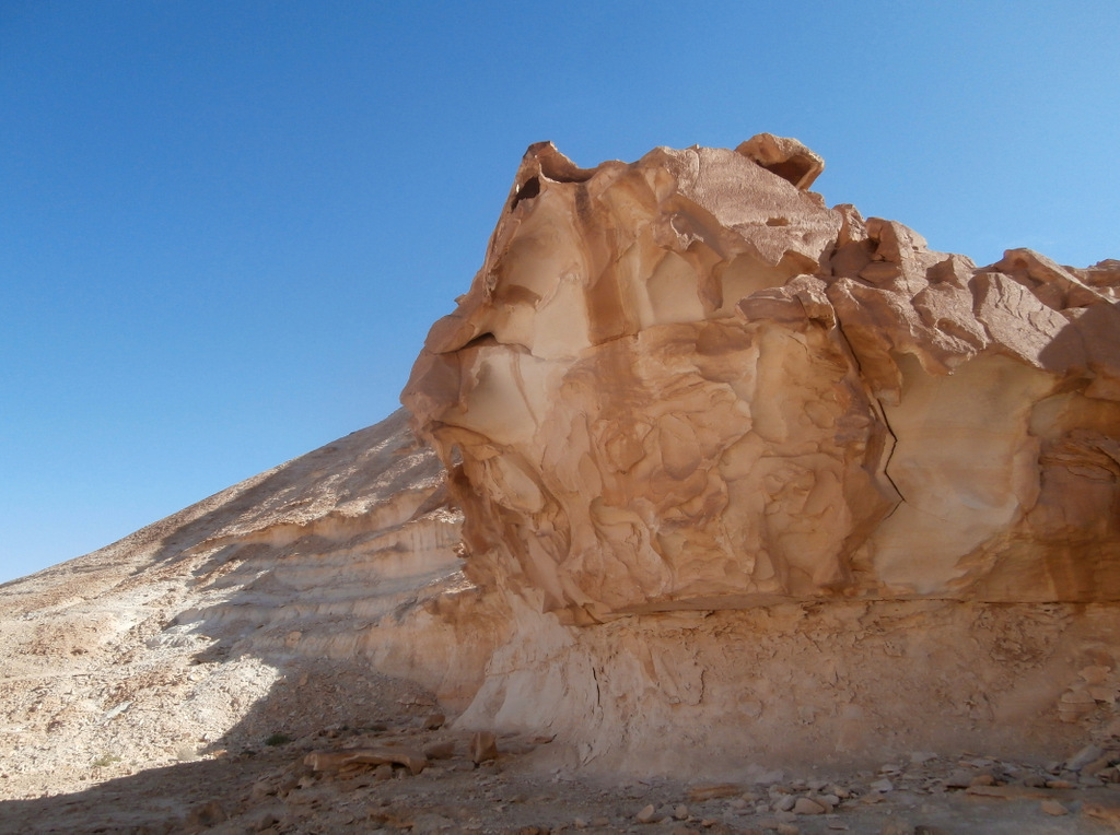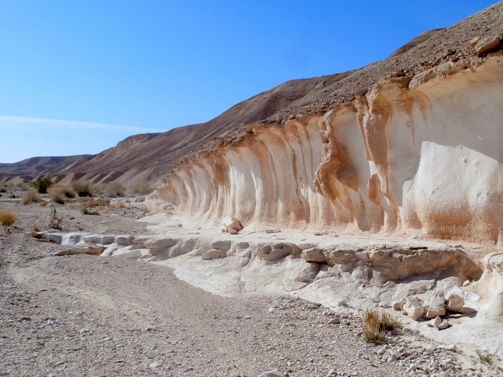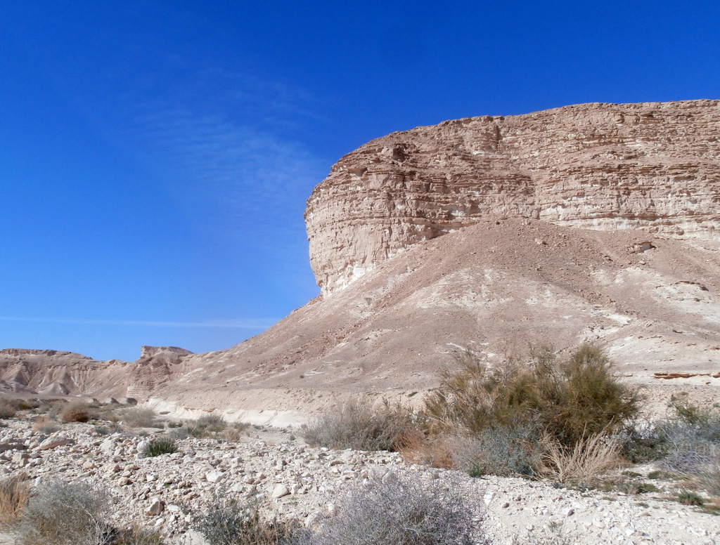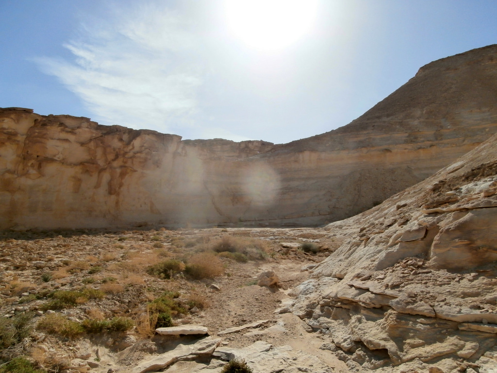 Вокруг было множество боковых русел, вот и пойми, какое из них Цофар. Но в тот момент я была уверена, что нахожусь именно в русле нахаля Цофар. В общем, так оно и было, только вскоре надо было идти вправо, но это я пойму позже. А пока я шла с левой стороны русла и забрела в очень красивое место с необычной горкой. Ветра и дожди изрезали твёрдые породы поперёк, и получились ярусы для зрителей, как в амфитеатре.