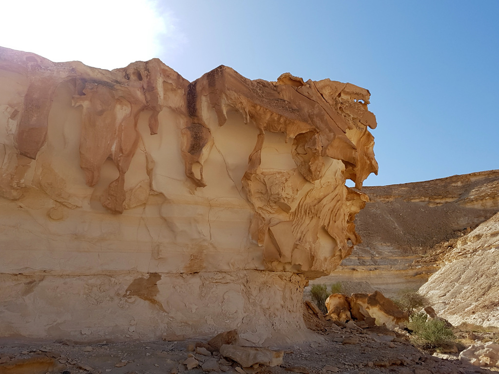 Очень осторожно, опираясь на палки (мои главные помощники), я спустилась с горки, и вот здесь совершила ошибочное действие. Я направилась по вади направо, в то время как на нужный мне нахаль Цофар, требовалось идти налево. Таким образом, я пошла «не туда». Но в результате, получилось даже хорошо, поскольку это «не туда» привело меня в очень красивое место с двумя водопадами и скалами с наплывами, которые я называю «взбитые сливки». Там был целый музей таких скал!