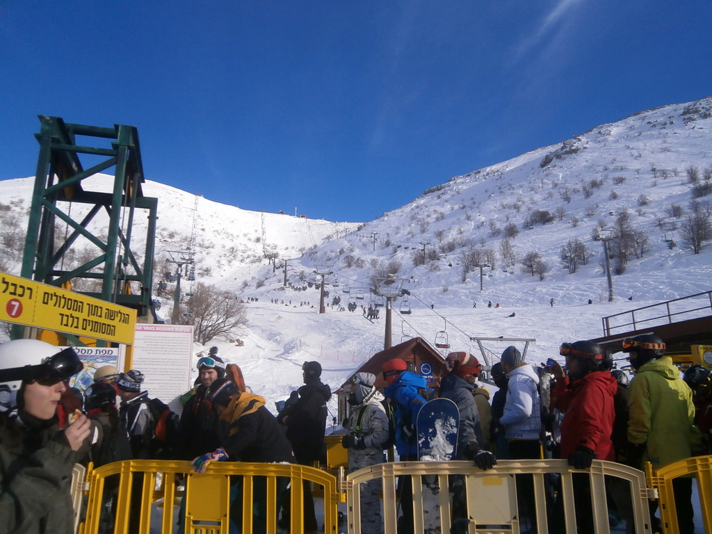 Хоть я и поехала на Хермон не в первый день после открытия, а во второй, людей было очень и очень много. Уже в Мадждаль Шамсе всё движение было парализовано. Длиннейшая пробка, несмотря на будний день. Это было неприятным сюрпризом, ведь в предыдущие разы никаких пробок не было. После длительного стояния в веренице машин, я наконец добралась до касс, оттуда до нижней стоянки, а затем уже на шаттле — до офиса, где оплачиваются лыжи и ски пасс. Пока стояла в длинной очереди, объявили, что ботинки закончились. У меня, к счастью, есть свои.