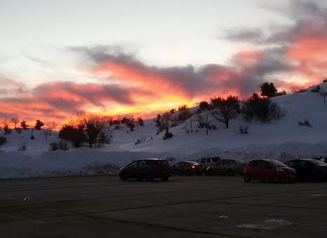 Получив лыжи, я только в 12 часов (!!!) вышла на трассы, а ведь из дому выехала в 5. На катание оставалось всего 4 часа, и их я откатала на всю катушку. Каталась до самого закрытия. Трассы были отличные, с хорошим снежным покровом.Однако всё омрачалось тем, что на подъёмники были большие очереди. Иногда стояла по 30-40 минут. В конце дня, как утешение, удостоилась увидеть фантастический закат.