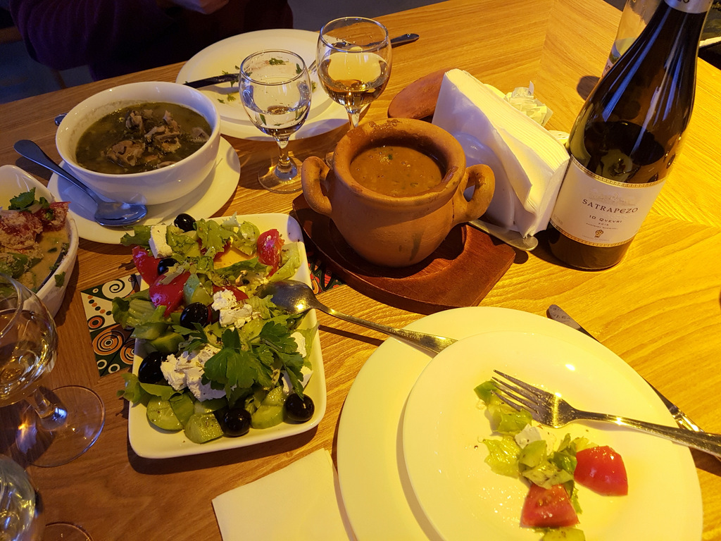 В 7 часов пошли на ужин. Решили сменить ресторан. Зашли в несколько, в конце концов выбрали один из них. Там было много народу, чувствовалось, что ресторан популярный. Мы пили белое грузинское вино и ели хинкали и шашлык. Еда была вкусная.