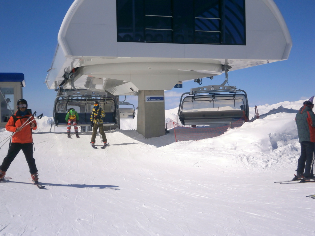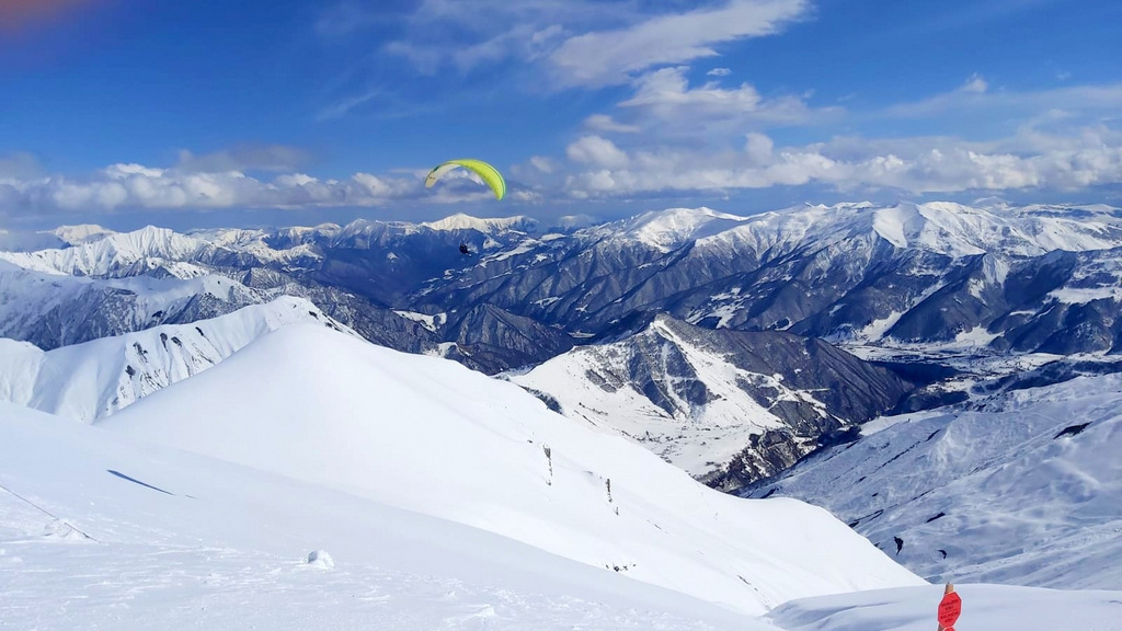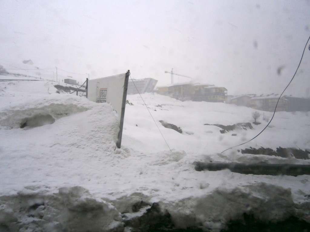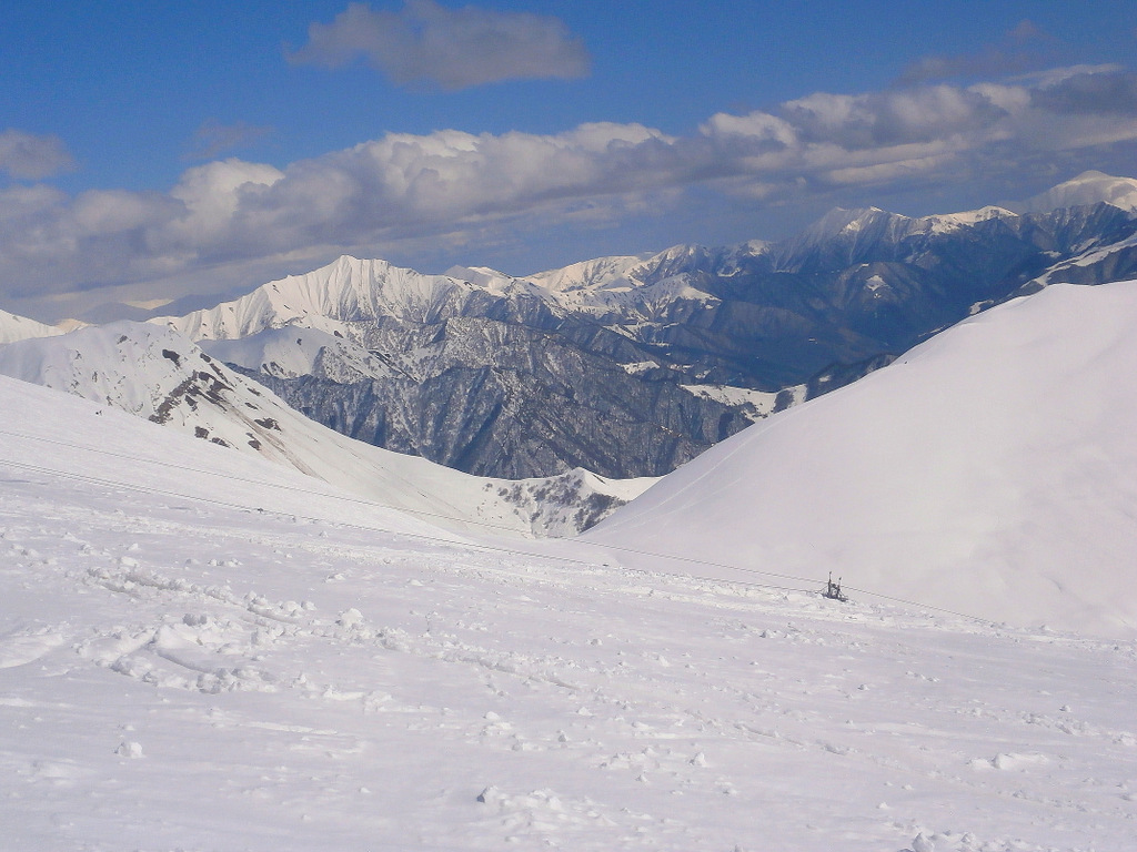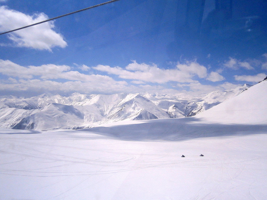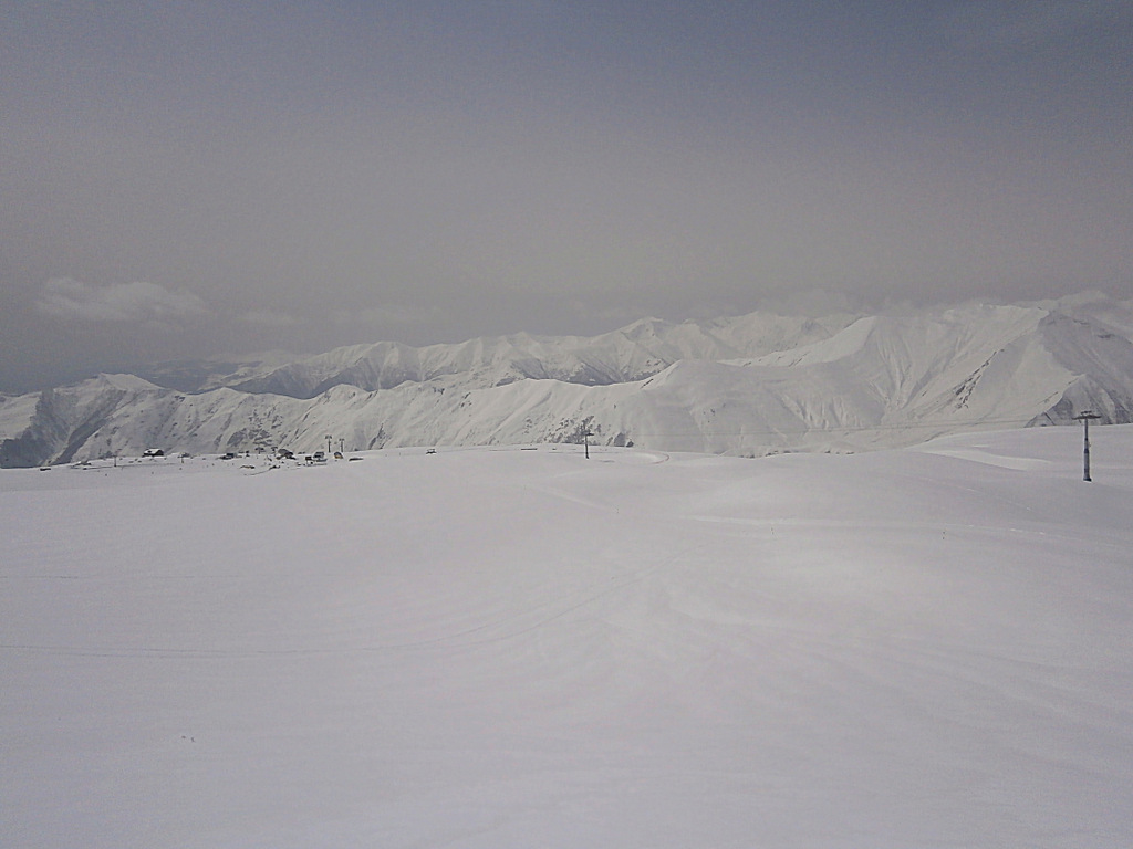 В перерыве, воспользовавшись отличной погодой и прекрасной видимостью, мы поехали на гондоле на перевал Коби. На этом участке гондолы обычным лыжникам разрешается ехать только без лыж, с целью посмотреть. С перевала можно спуститься на лыжах по трассам, но в данный момент трассы не обустроены. С лыжами могут посадить исключительно тренеров (по блату), которые едут катать фрирайд.