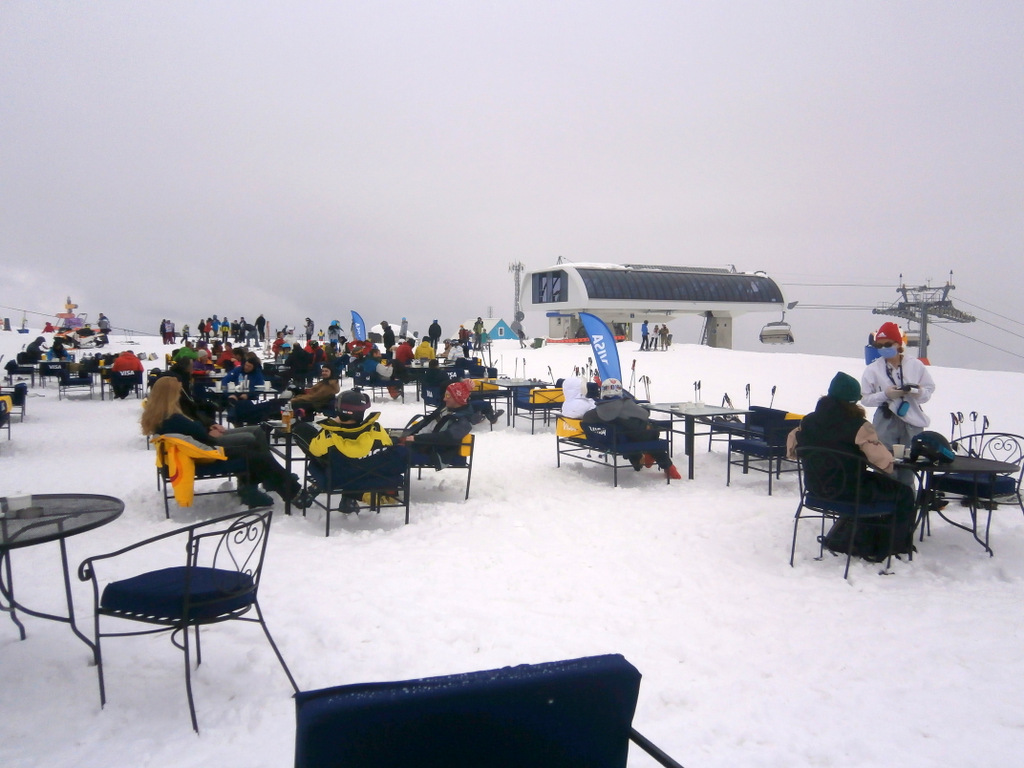К этому моменту я изрядно устала, а также хотела пить и, извиняюсь за подробность, писять. Надо отметить, что туалетов в зоне катания почти нет. А те, которые есть — полный отстой. Находятся на улице, завалены снегом, и в них не зайти.