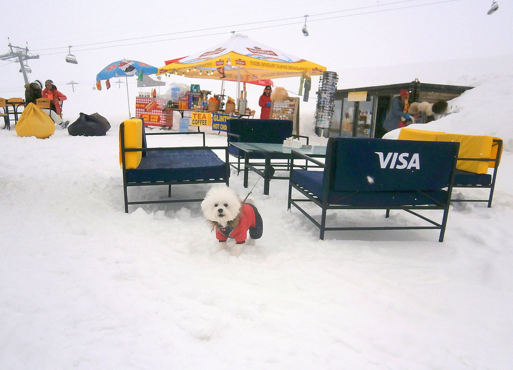 Спустилась в нижний Гудаури. На подъёмнике познакомилась с молодым грузином. Его собачка Коби бежала внизу по снегу, сопровождая нас.