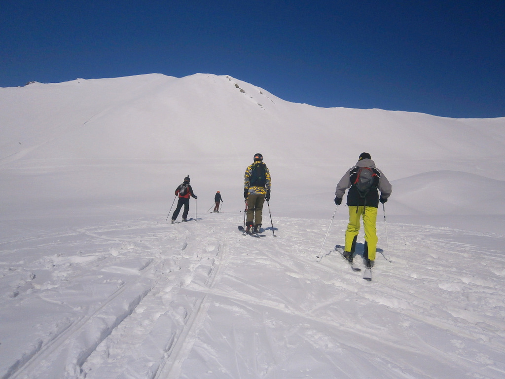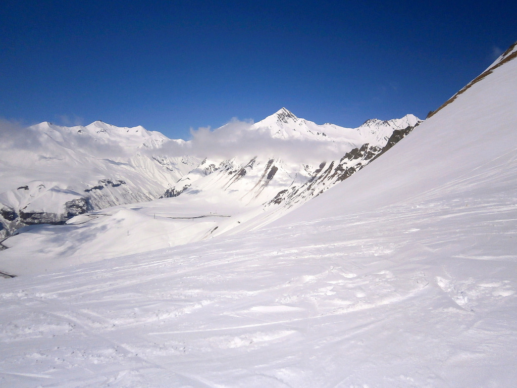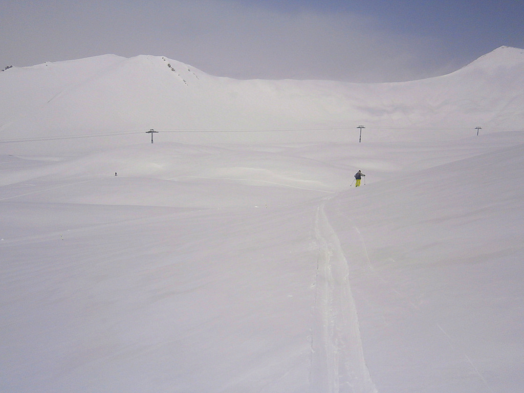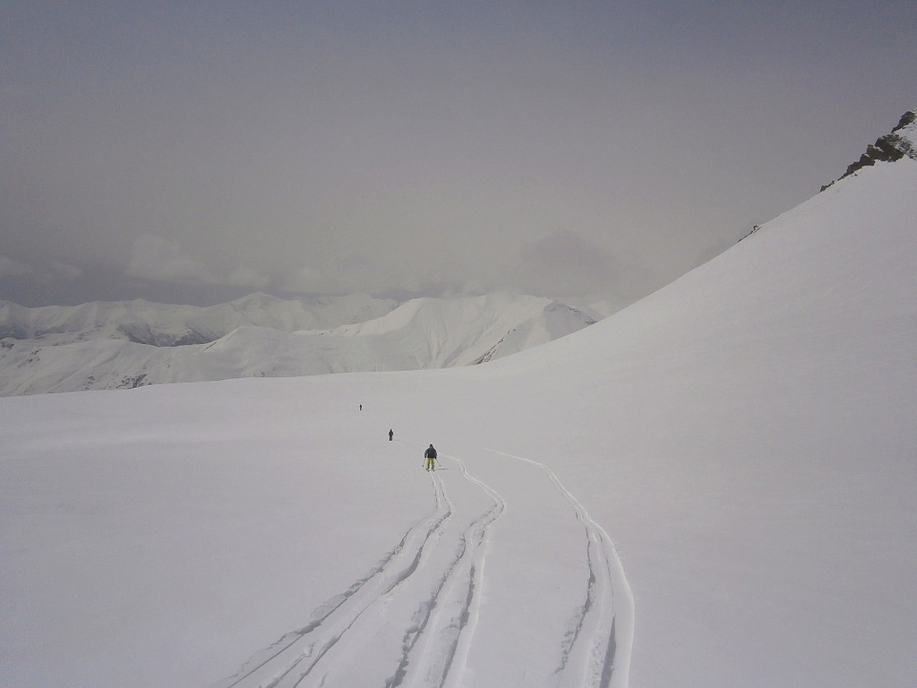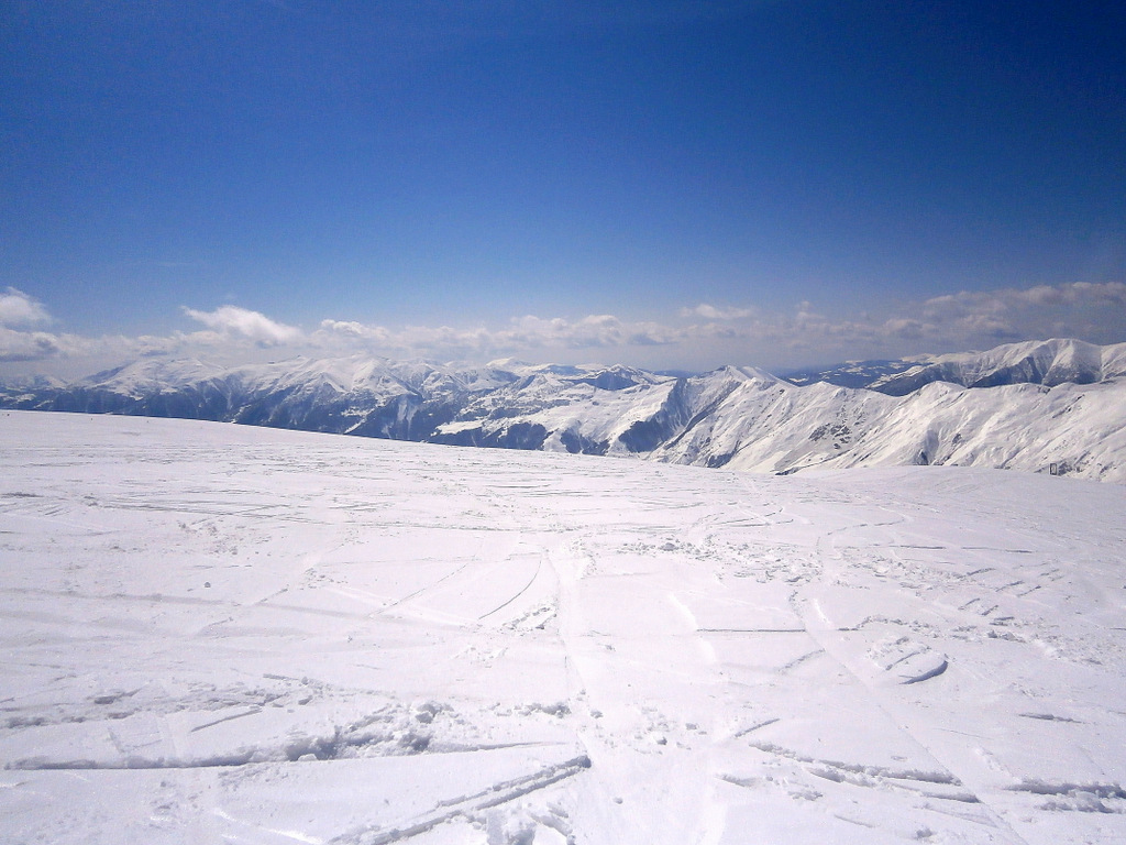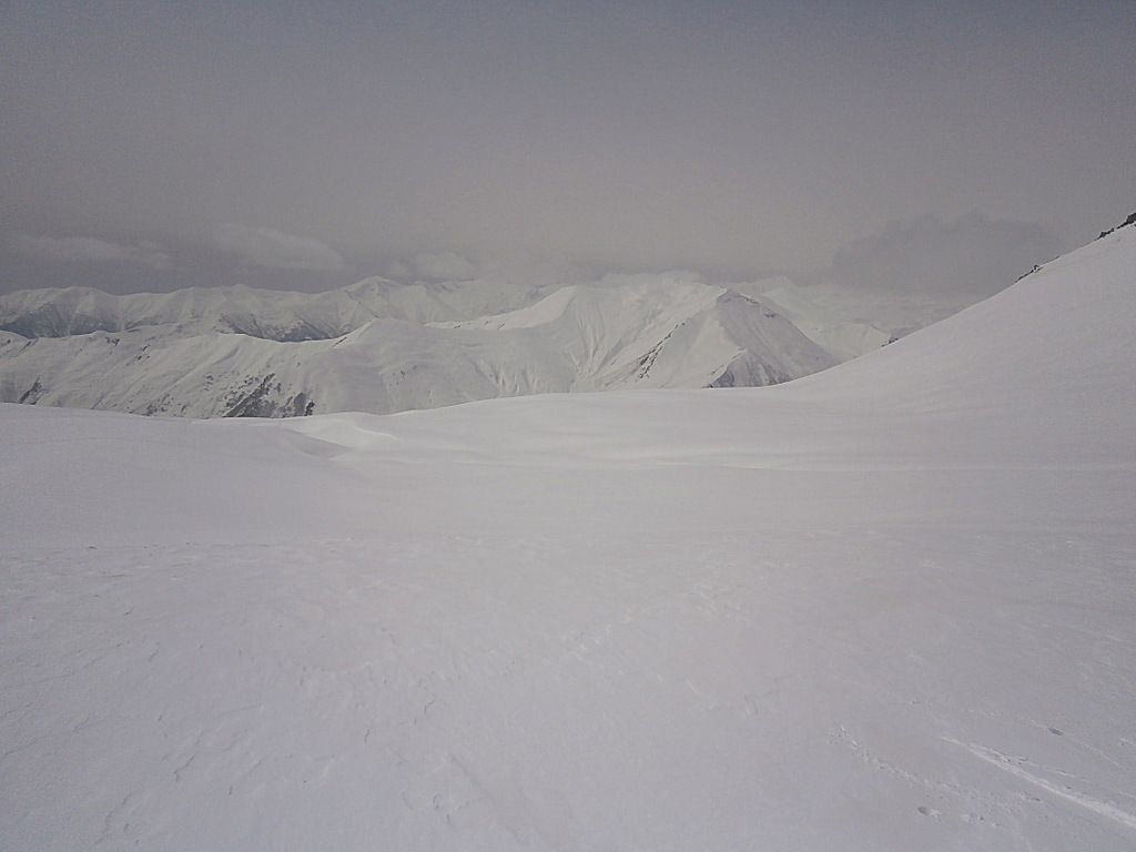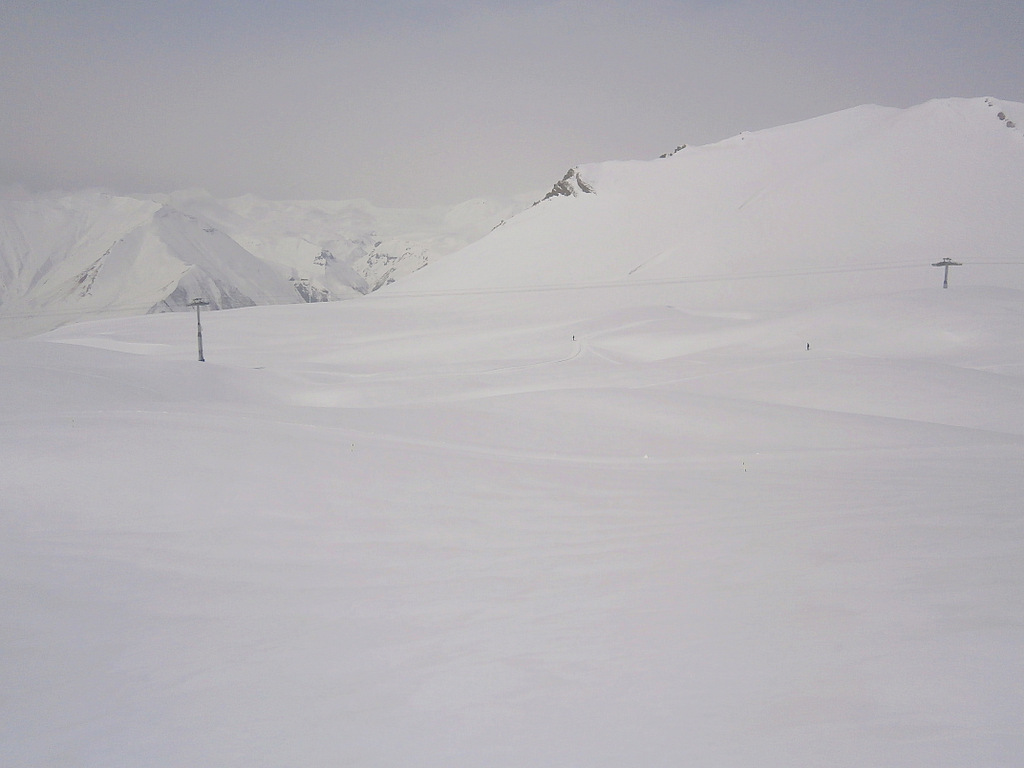 Второй раз поехали по новой для нас фрирайдной местности. Находится эта местность под горой Кудеби, в правом углу, если смотреть на карту трасс Гудаури (снежные поля горы Бидара находятся в левом углу, если что). Тем просто бескрайние просторы и нетронутая целина.