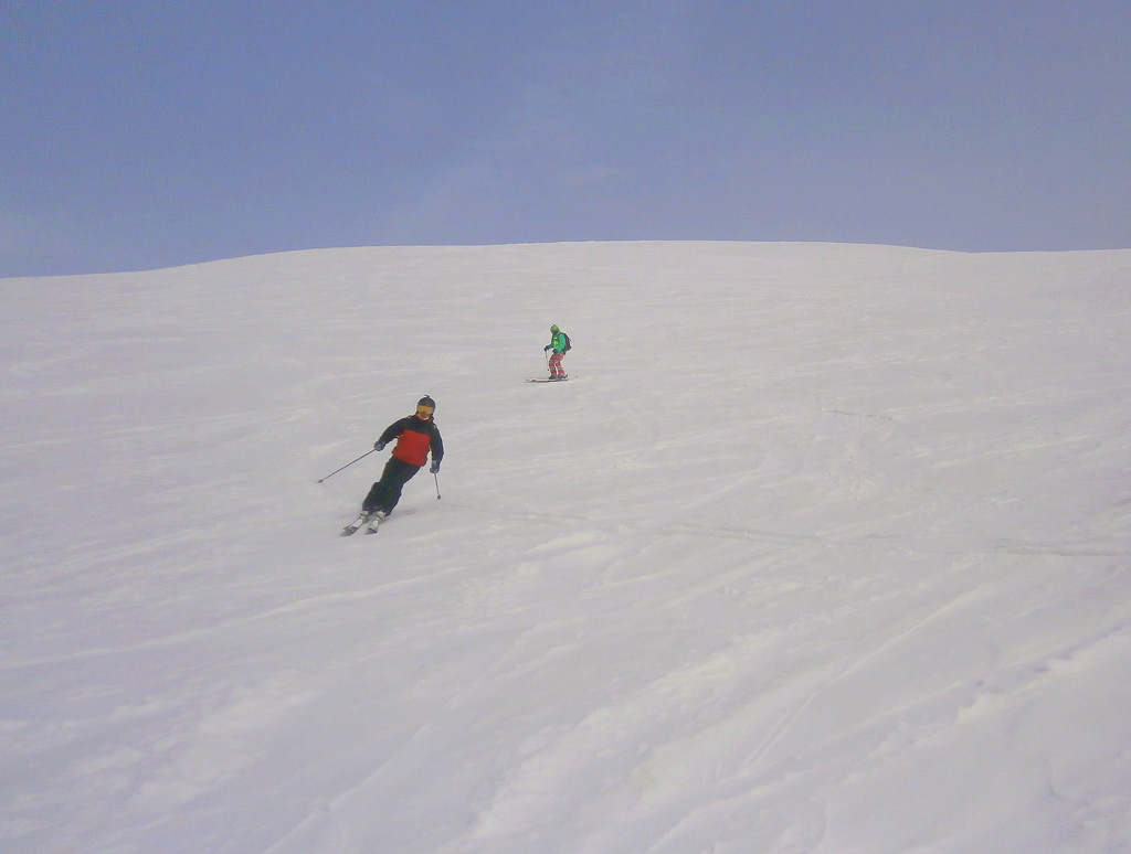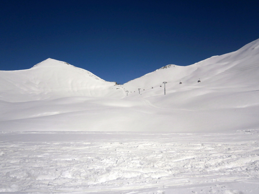 Поднялись на Кудеби. Это гора высотой 3006 метров. С неё поехали по синей трассе, которая иногда крутая, и заезжали на целину. Мне очень нравится катание вне трассы. Снег мягкий, пушистый. Его — много. Никаких тебе камней или кочек. Бескрайняя снежная гладь. Кати себе и кати!