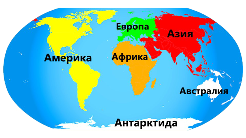 Материки: Евразия, Африка, Северная Америка, Южная Америка, Австралия и Антарктида.
