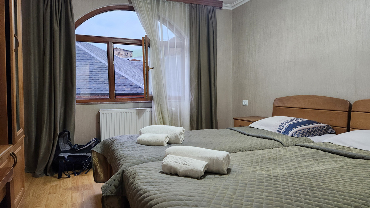 В Местию мы приехали в 20:00. По дороге я спала. Бессонная ночь давала о себе знать. Поселились в гестхаусе «Ушба». Нам с Юлей досталась досталась шикарная комната. Как впоследствии выяснится — это была наша лучшая комната в поездке.