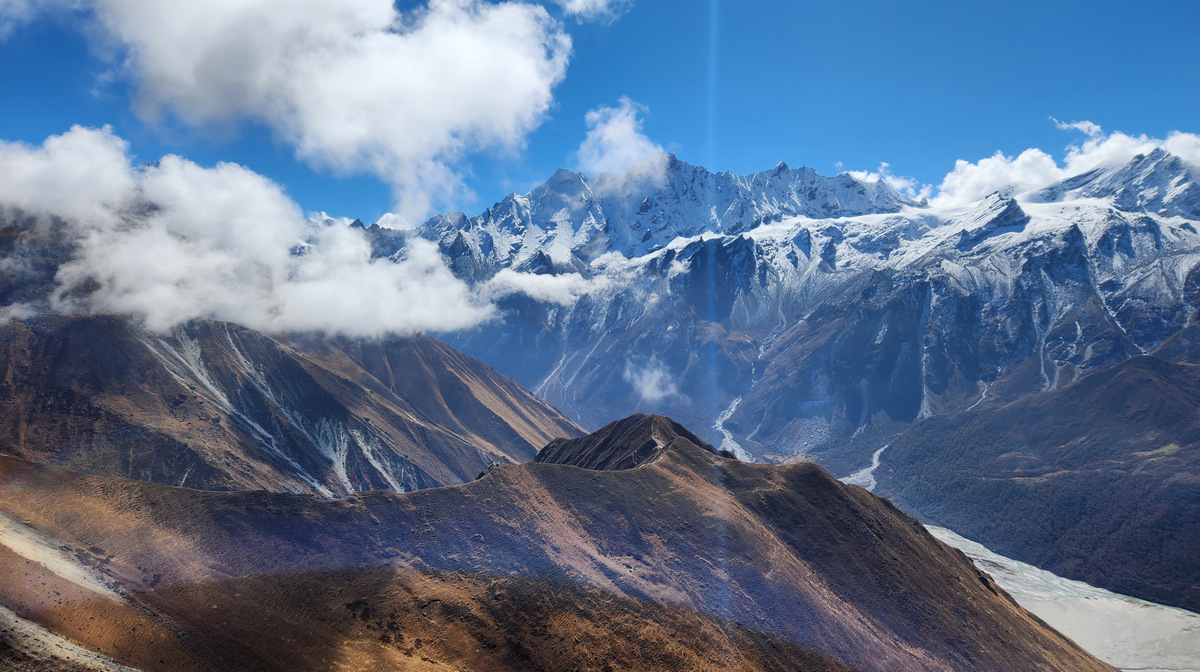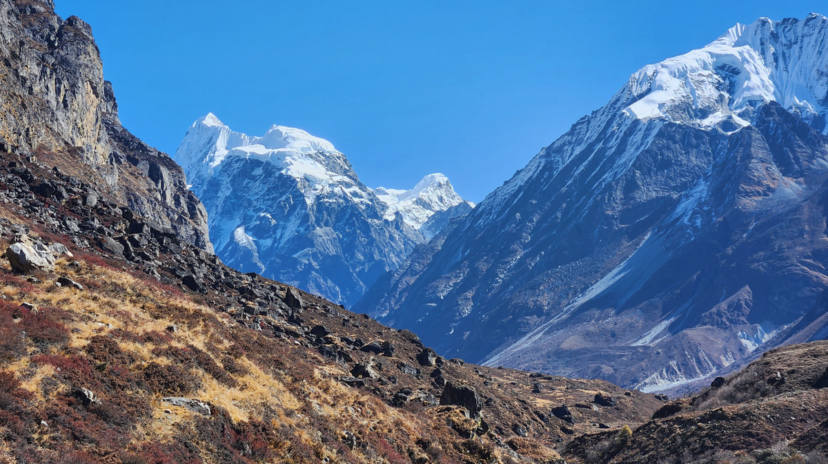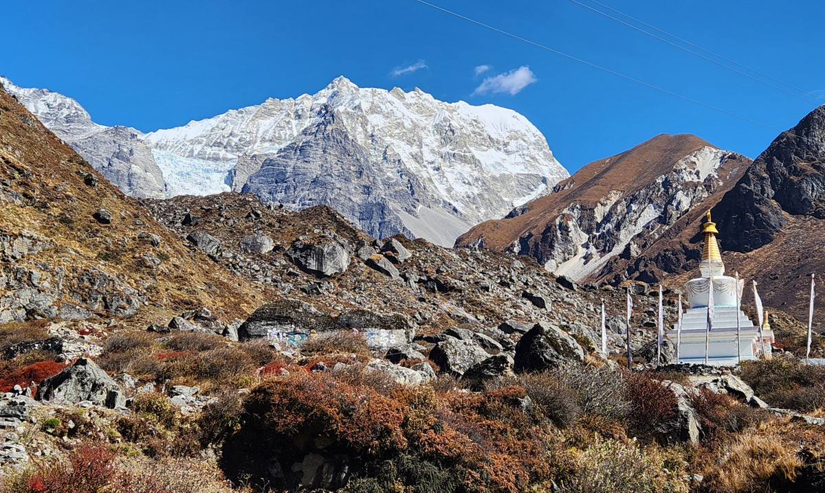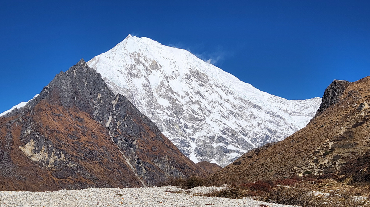 С утра погода ясная, и если оглянуться назад, мы видим на фоне чистого голубого неба белоснежную вершину горы Лангтанг Лирунг, высота которой 7227 метров. Красавица-гора возвышается над долиной, она довольно близко, и вид на неё — потрясающий.
