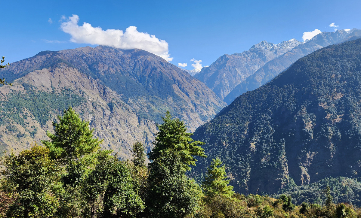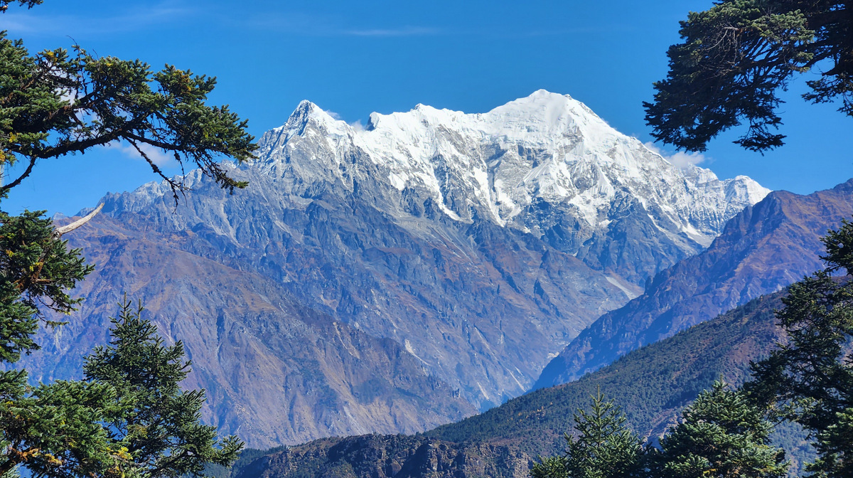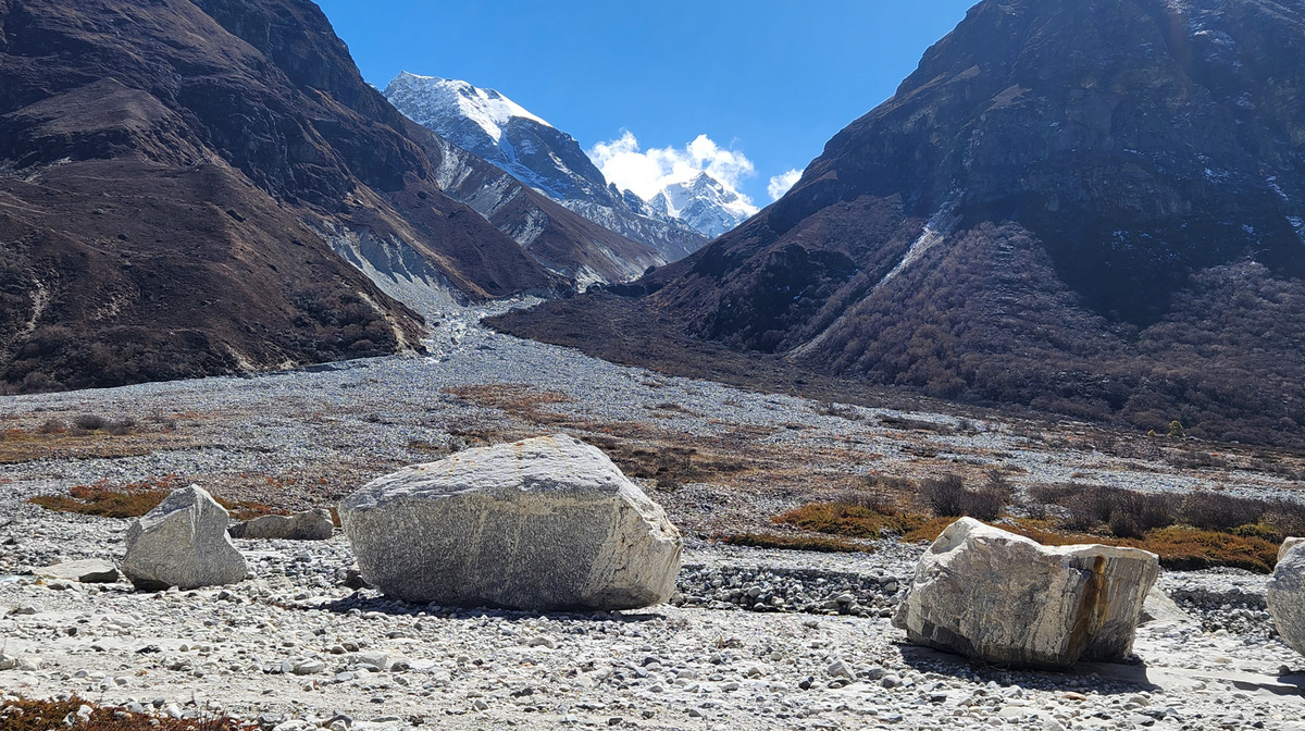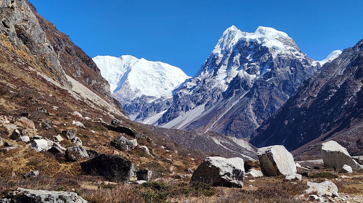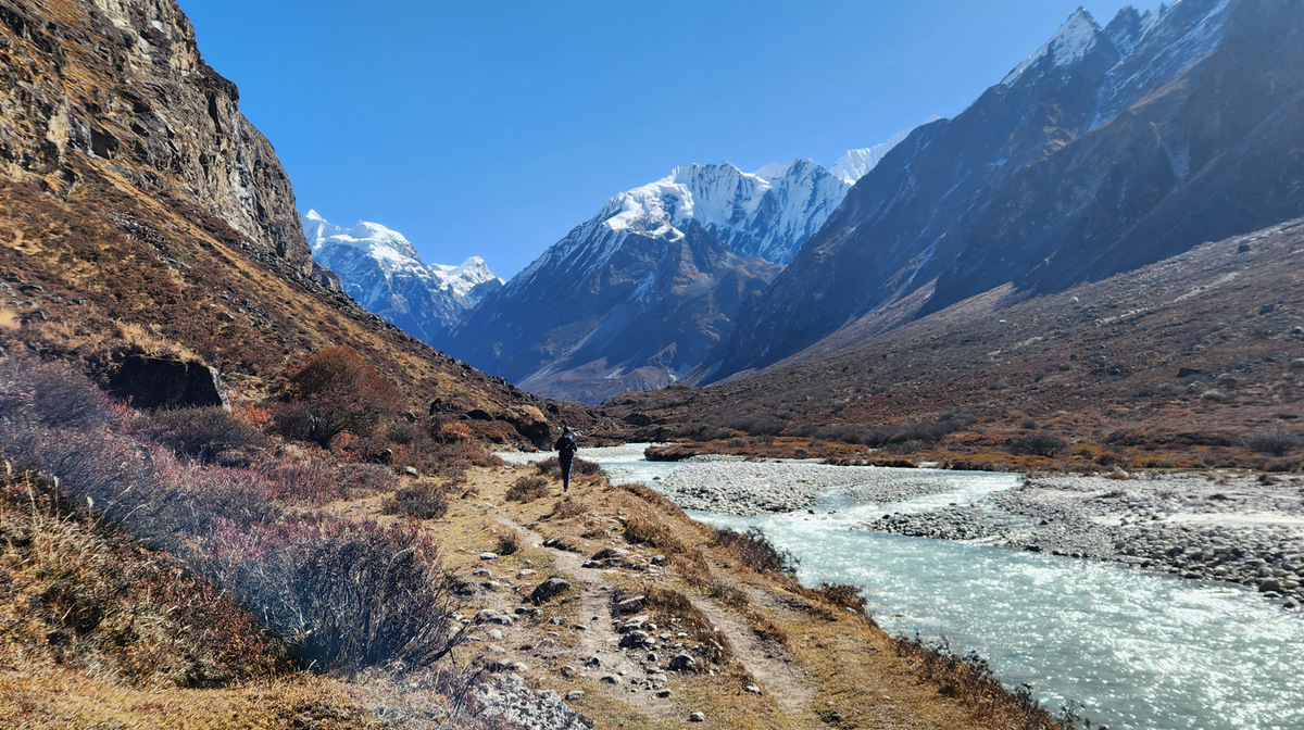 С утра погода ясная, и если оглянуться назад, мы видим на фоне чистого голубого неба белоснежную вершину горы Лангтанг Лирунг, высота которой 7227 метров. Красавица-гора возвышается над долиной, она довольно близко, и вид на неё — потрясающий.