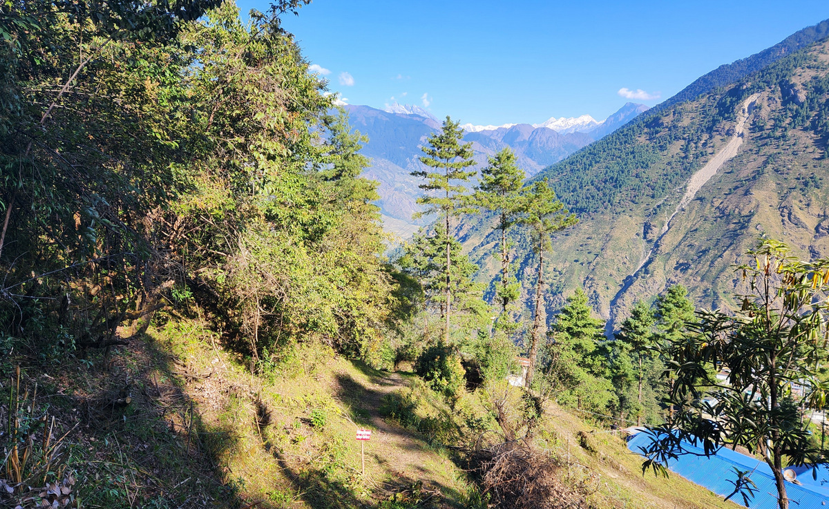 Вид с тропы на ущелье Лангтанг. На противоположном склоне видна джиповая дорога к Шерпагаону.