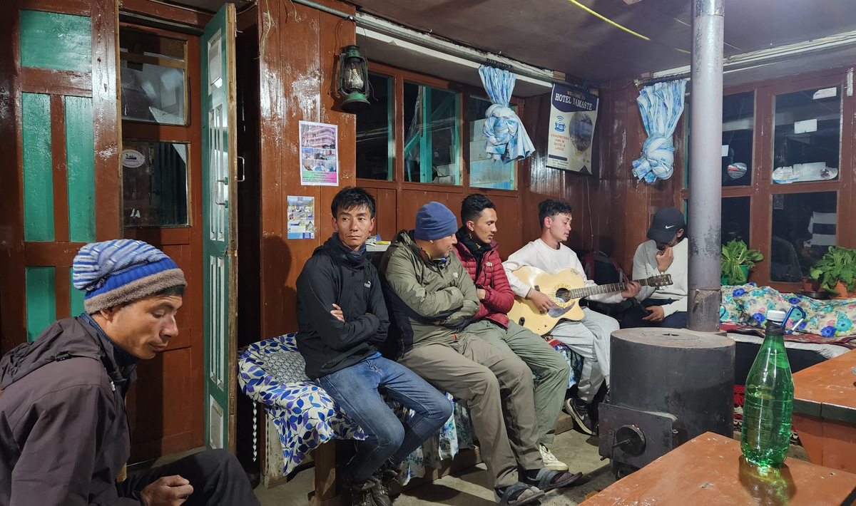 Вечером в столовой было очень уютно. Пришла компания ребят, которых мы встретили вчера на подъеме в Туло Сябру. Тогда они сказали, что идут в Синг Гомпу. А сегодня они уже сбегали на озера и вернулись назад. Сильные, однако! Молодые…
