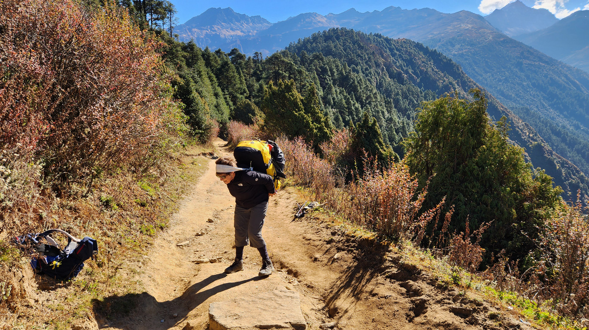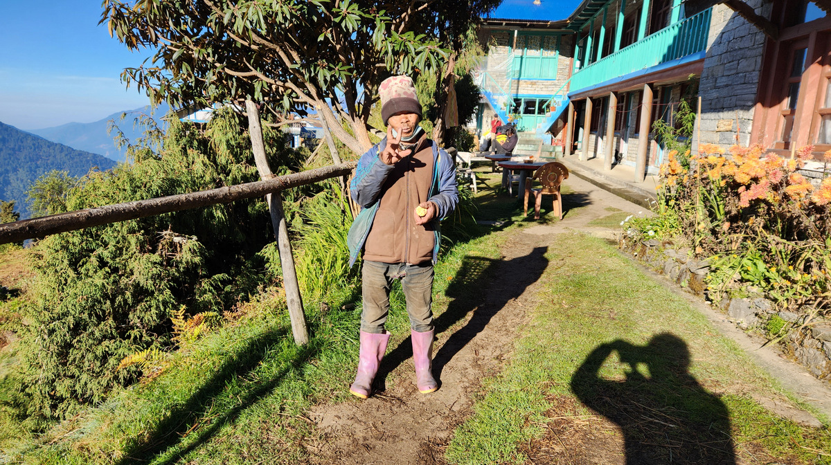 За завтраком у меня состоялось общение с маленьким непальским человечком. Я его заприметила ещё вчера. Он лазил по крутым склонам, когда мы шли по лесной тропе. А потом вернулся именно в наш лодж с плетеной корзиной, полной дров.