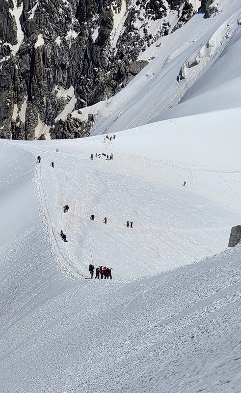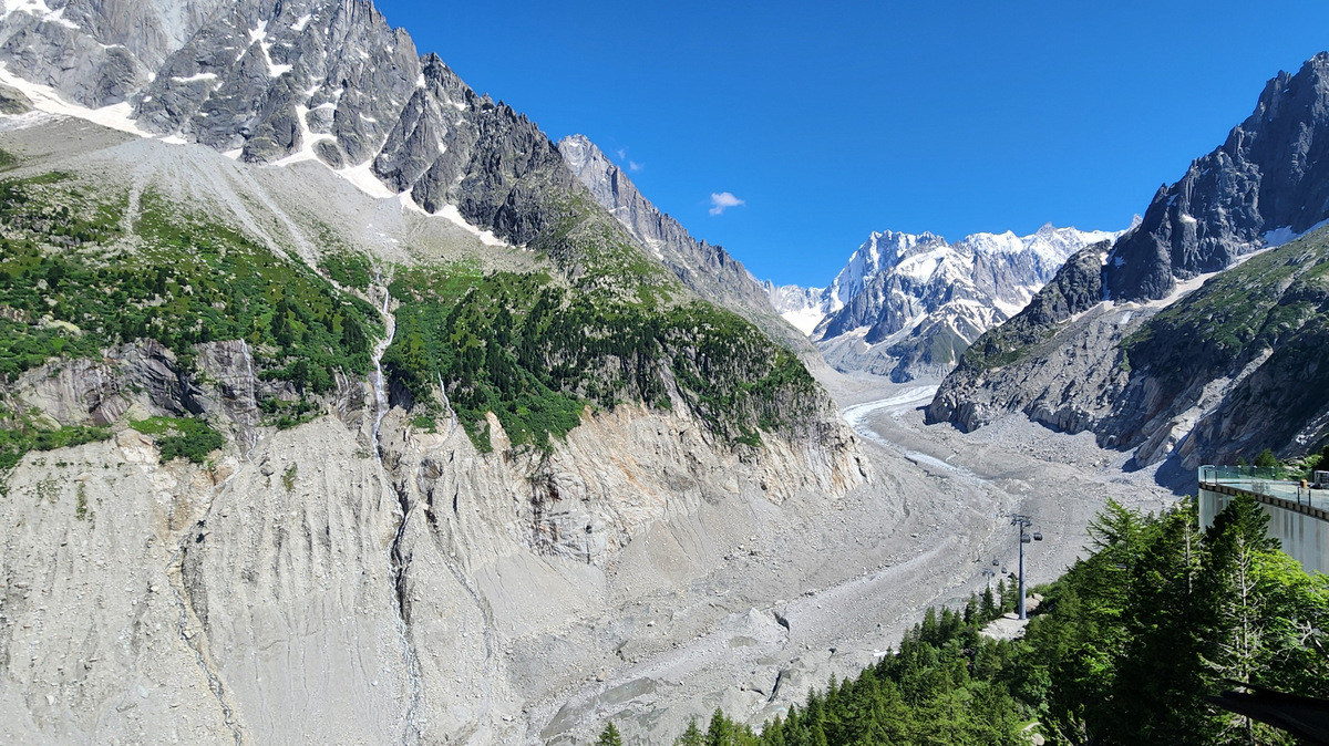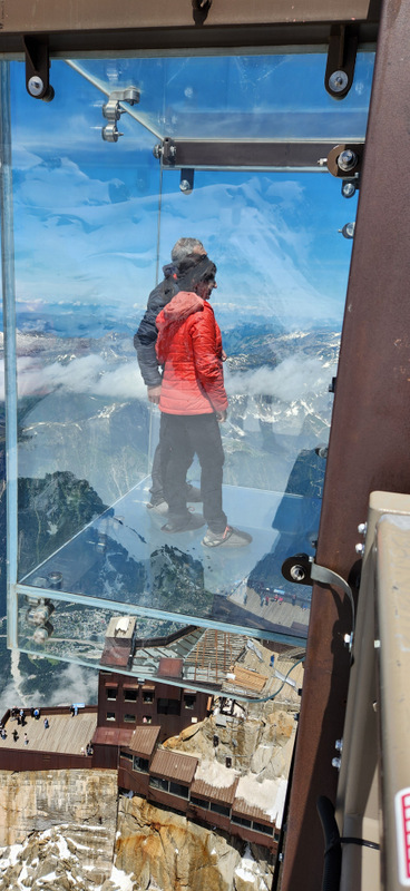 Были вознаграждены довольно красивым видом на ледник. Кстати, площадка так и называется: Belvedere du Glacier des Bossons (Прекрасный вид ледника Воссон). Поднялись до высоты 1564 метра. Набрали от Шамони 500 метров по вертикали.