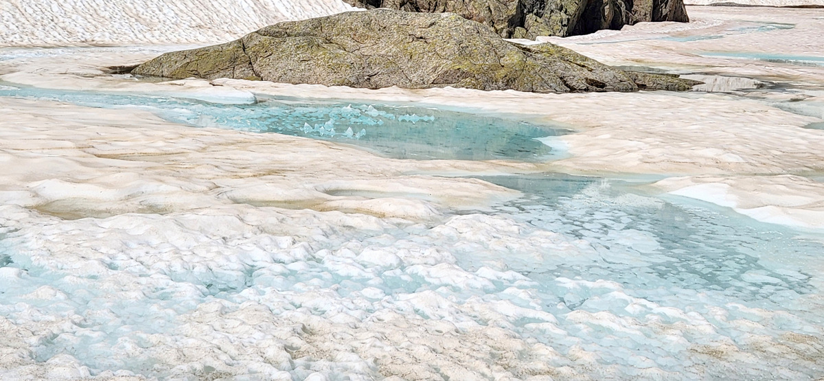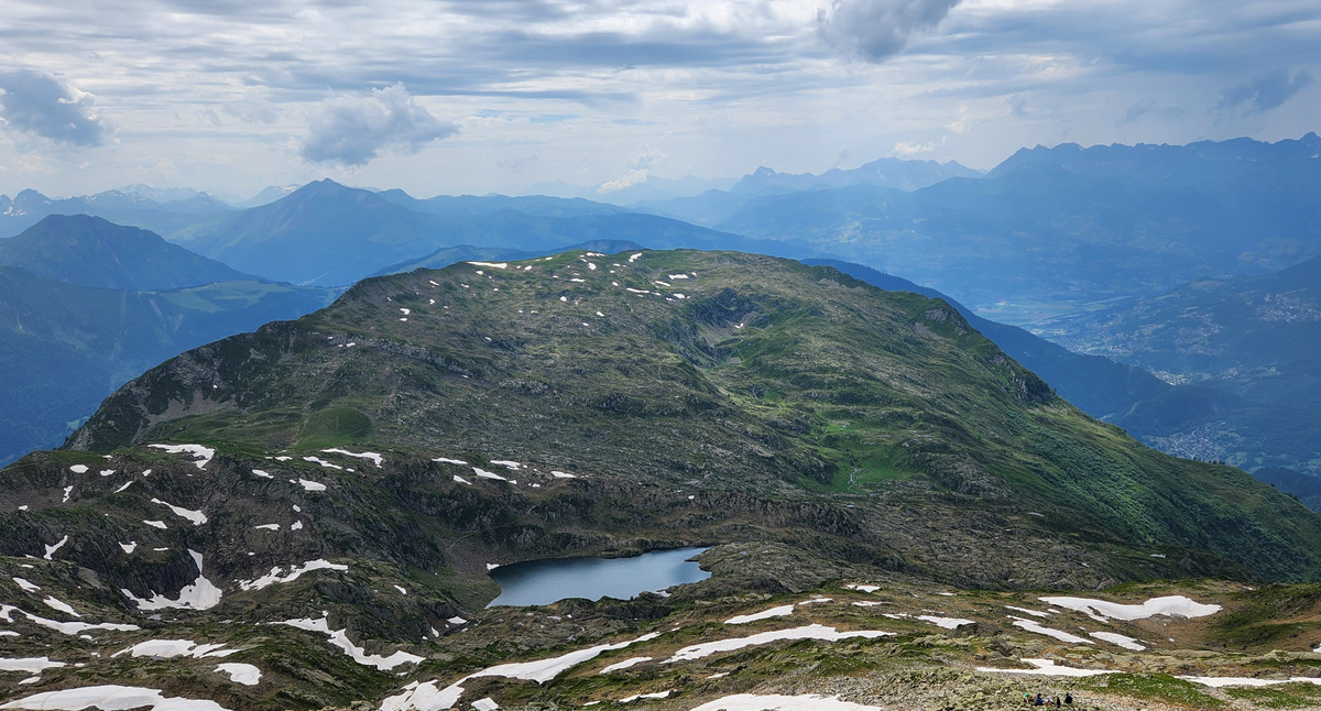 Вид с вершины Бревент. Много снежников, на радость людям.
