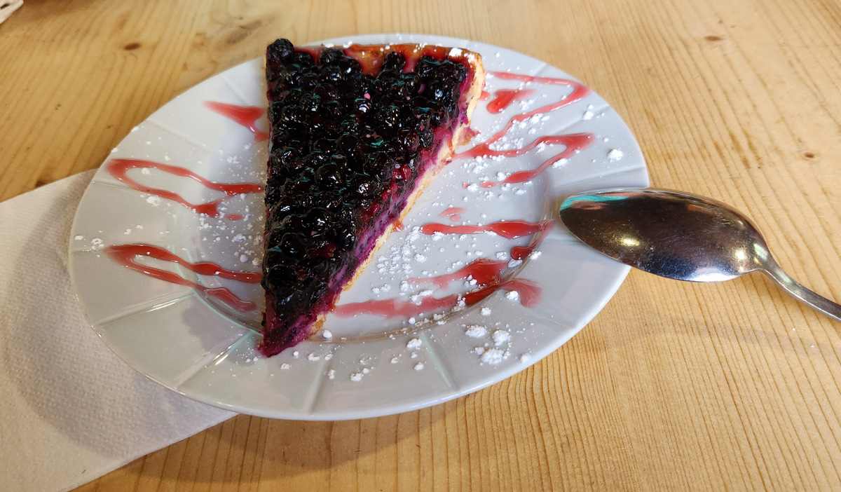 Столики расположены на большом балконе с шикарным видом на Монблан. Очередь в ресторан была большая, но мы в неё встали, так как решили отведать фирменного пирога с черникой, о котором я прочитала в отзывах на Tripavizor.